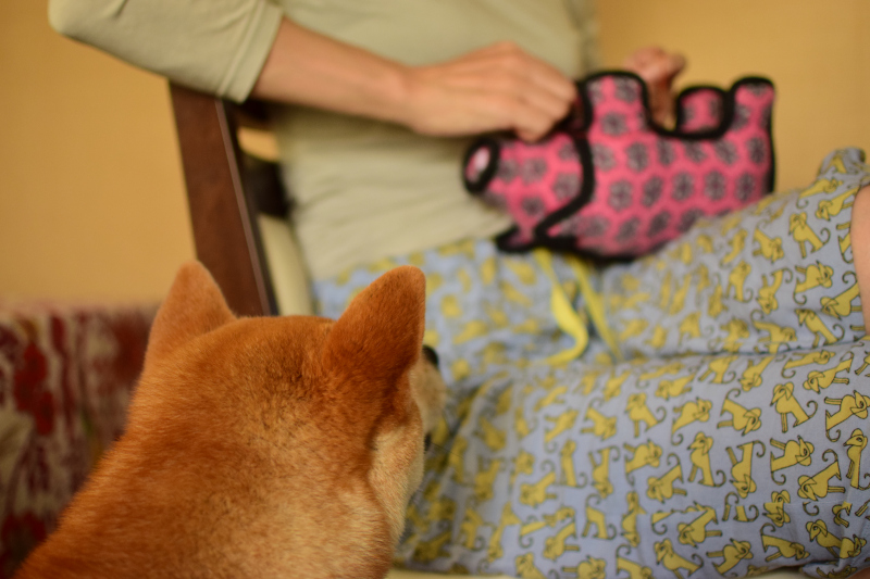 今日の写真は2014年、コムギ1歳9ヶ月。コムギは新しいおもちゃを与えると、取り敢えず破壊します。遊ぶというより、破壊が目的なのではないかと思っています。サムネイルは破壊されたおもちゃを飼い主が縫い合わせているところです。この時のコムギはじっとおもちゃを見つめ、作業が終わるまで大人しく待っているとても良い子なのです。