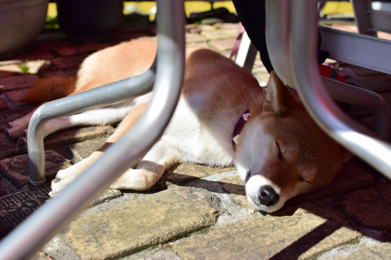 今日の写真は2014年の白馬旅行、コムギ2歳1ヶ月です。気持ちよさそうなテラス席を発見したので、ちょっと寄り道。風通しが良い最高のロケーション。この日は天気も良く、飼い主はビール、ワイン、、、とついつい長居してしまい、コムギがお昼寝してしまいました。コムギは外では良い子なので、カフェで長居しても一言も発しません。