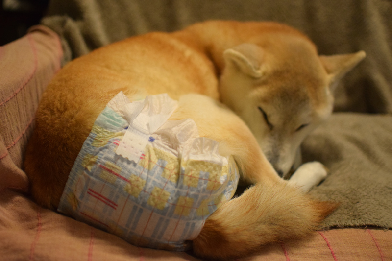 コムギの体重は10kgちょっと。食欲は相変わらずなく、下痢も完治していません。どうしたらいいか分からず焦っています。夜中にウンチがしたいと言って、何度も散歩に連れて行くのですが、飼い主は毎夜のことで寝不足のため、疲労困憊。コムギの行きたいサインに気付かず爆睡してしまうことがあるので、オムツを試してみることにしました。まだ、オムツをした状態で、ウンチをしたことはありません。コムギは神経質なので我慢してしまって出来ないかもしれません。状況は深刻ですが、コムギのオムツ姿…かわいい(笑)オムツには尻尾を通すための穴が空いているんです。かわいいじゃないか…。コムギに似合うピンク色のやつを探そうと思います。
