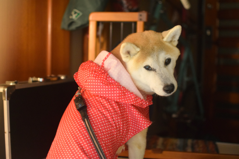 雨の日が続いてコムギの散歩意欲はますます落ち込んでいます。コムギのレインコート姿は可愛いですが、本人は着せられて不本意なのでしょう。とても憂鬱そうです。